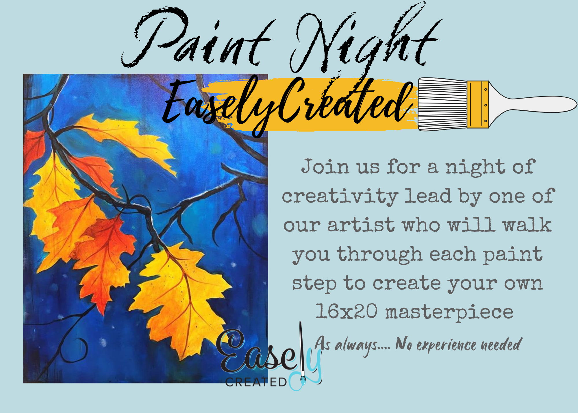 WEATHER CANCELLATIONS: If an event should ever need to be canceled due to weather, I will offer a backup date. If you are not able to attend the new date, you will be given a full refund. We ask that you leave the correct phone number and email at checkout as thats the quickest way to update you if we should need to cancel. Easely Created reserves the right to cancel classes due to low enrollment or unforeseen circumstances. There needs to be a minimum of 6 painters signed up for a class for us to have the class. If that minimum is not met, registrants will be notified prior to class time and refunded. (Private parties require a minimum of 8 painters)