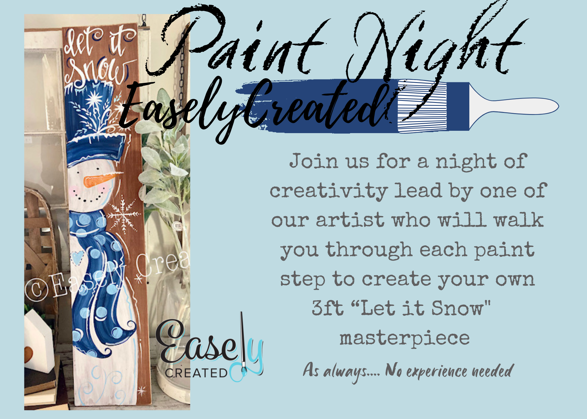 WEATHER CANCELLATIONS: If an event should ever need to be canceled due to weather, I will offer a backup date. If you are not able to attend the new date, you will be given a full refund. We ask that you leave the correct phone number and email at checkout as thats the quickest way to update you if we should need to cancel. Easely Created reserves the right to cancel classes due to low enrollment or unforeseen circumstances. There needs to be a minimum of 6 painters signed up for a class for us to have the class. If that minimum is not met, registrants will be notified prior to class time and refunded. (Private parties require a minimum of 8 painters)